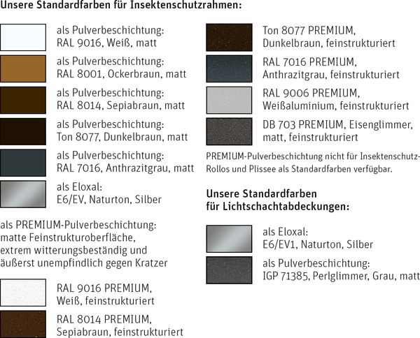 Bei der Planung Ihres Insektenschutzsystems stehen Ihre räumlichen Gegebenheiten und der technische Aufbau Ihrer Fenster an erster Stelle. Aber natürlich soll das Ganze auch gut aussehen. Dafür ist proflytec bekannt. Durch die sorgfältige Konstruktion der Profile produzieren wir Elementrahmen, die optisch wie aus einem Guss wirken. Ganz wichtig hierfür ist auch die Abstimmung der Rahmenfarben und die richtige Wahl des Schutzgewebes. proflytec führt die hier abgebildeten Standardfarben lagermäßig im Sortiment. Natürlich sind viele weitere RAL-, Trend- und Sonderfarben möglich. Eines ist sicher: unsere aufwändigen Farbbeschichtungsverfahren garantieren hohe Farbtreue und Langlebigkeit.